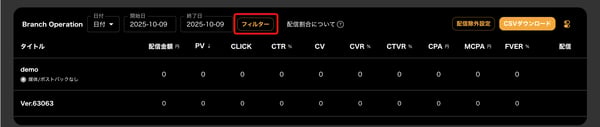 - Branch Operation画面右上の「フィルター」をクリック