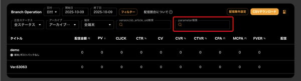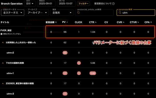 Branch Operationでは、特定の文字列を含む複数のパラメーターに紐づく数値(例:クリック数・CV数など)を合算して確認することができ、特定のキャンペーンや共通要素を持つパラメーターをまとめて分析したい場合に有効です。