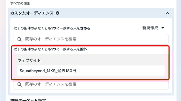 - オーディエンスセクションで「以下の条件に少なくとも1つに一致する人を除外」の表示がない場合は「広告のリーチをさらに限定」>「設定を切り替える」を選択