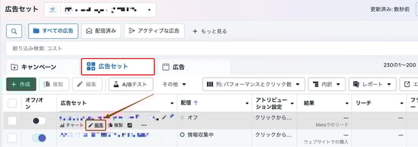 - Meta広告マネージャー > 該当キャンペーンを選択 > 「誰でもMKS」を設定したい広告セットの「編集」を開く