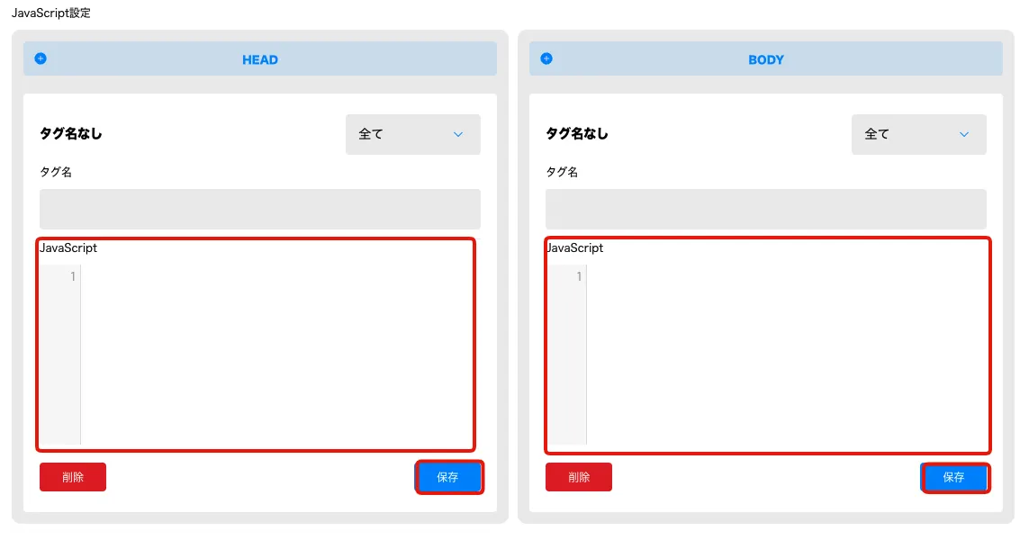 - JavaScript設定> +ボタンでHEAD/BODYの入力欄を作成