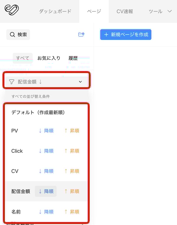 beyondページ一覧左側のフィルタープルダウンを押下すると並び替えが可能です。