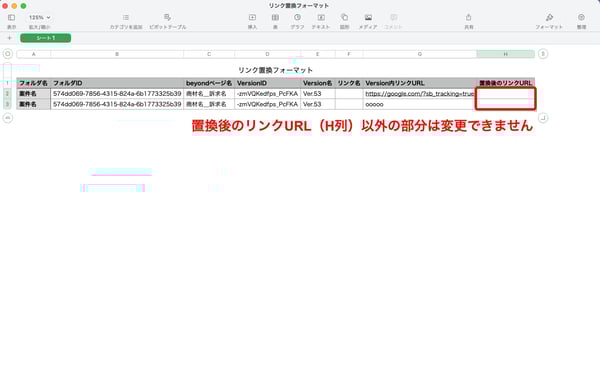- 読み込みエラーになる原因となりますので、H列(置換後リンク)以外の列は編集できません。