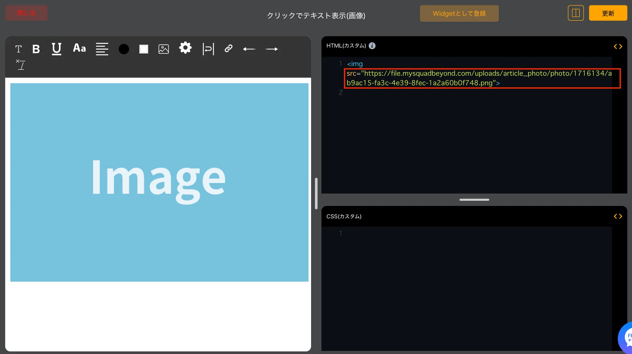 - HTML部分に以下のコードと挿入する画像のURLを入力する <img src="画像のURL">