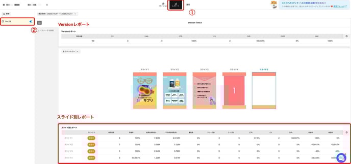 - 上部にはVersionごとのレポート、下部にはスライド別のレポートが表示されます