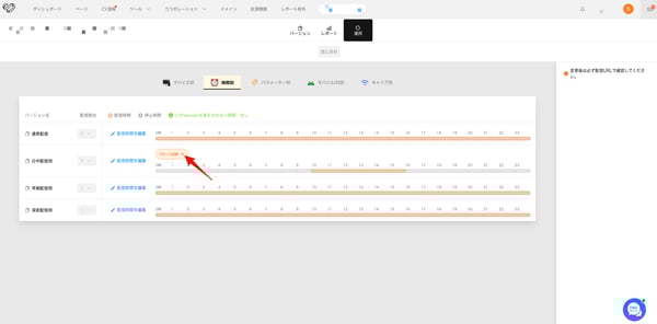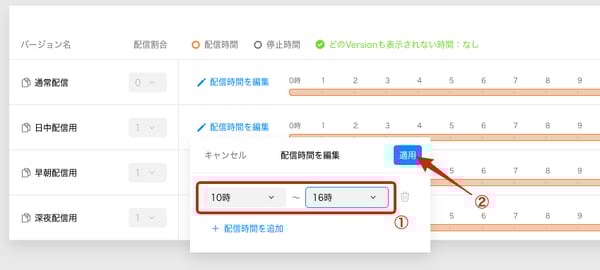 - 出し分け設定をしたいVersionの右側にある「配信時間を編集」>「配信時間を追加」 をクリック