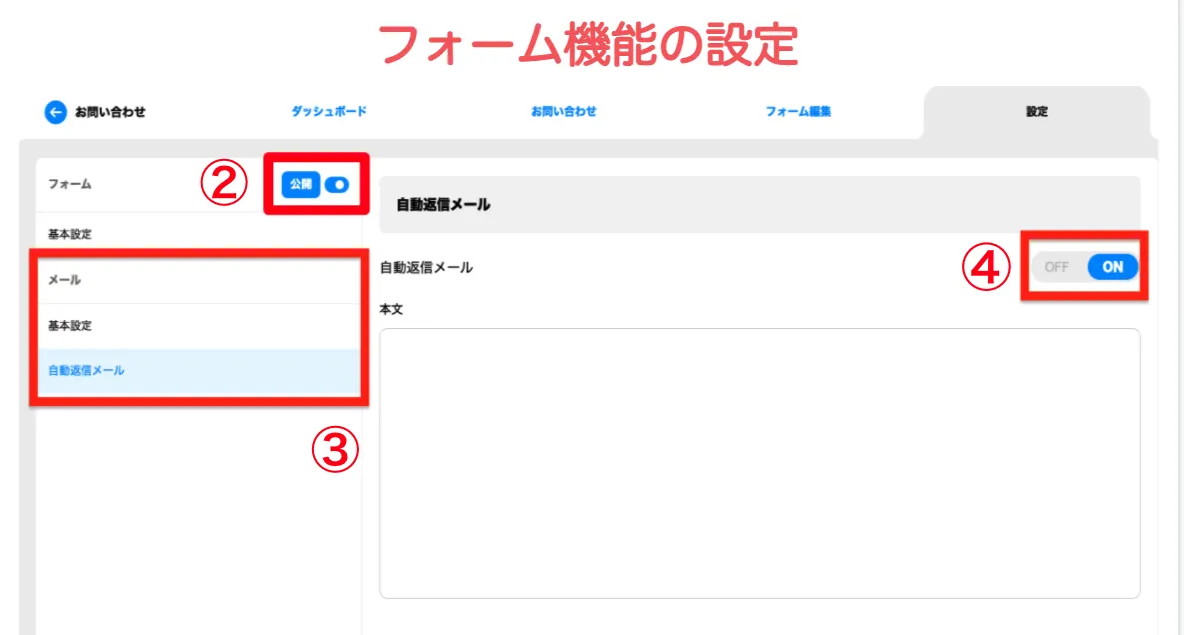 ③ユーザーに自動返信メールを送る設定をする場合は「設定」→メール「基本設定」から編集可能です