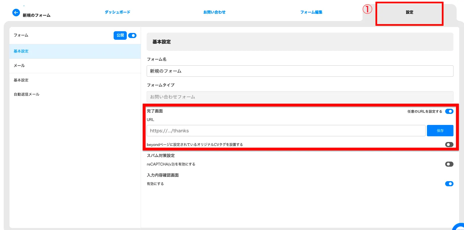※完了ページは任意のURLを指定できます。チェックボックスを青色の状態にしたあと、URLを入力してください