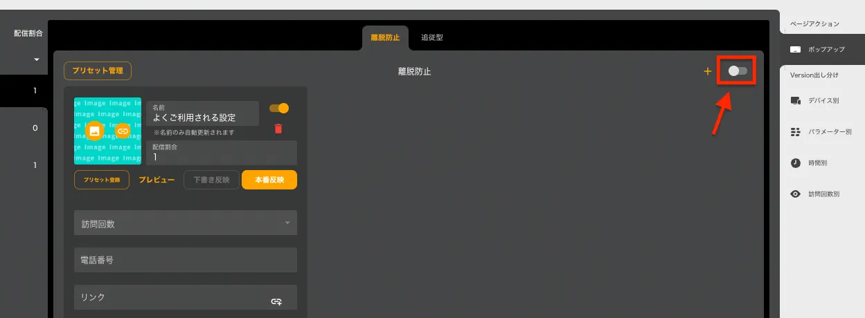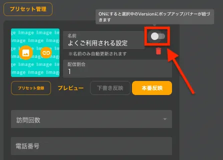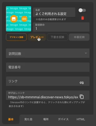 プレビュー > 下書きを確認する※プレビューURLをスマホで見るとスマホサイズに合わせたポップアップが表示されます※なお、ポップアップ画面右上のボタンをONにしない限り配信されているVersionにポップアップが表示されることはありません。
