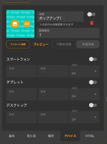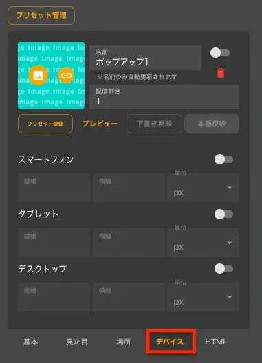 - サイズ調整したいデバイスをONにしてpxか%の単位を指定し、サイズを入力