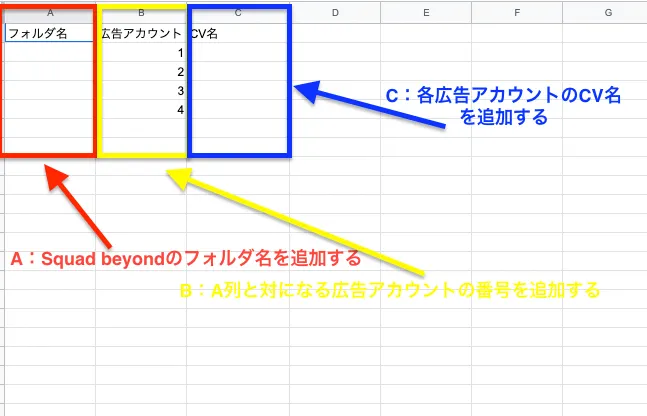 - C列:各広告アカウントのCV名を追加する(CV名が異なるとインポートできませんのでご注意ください)