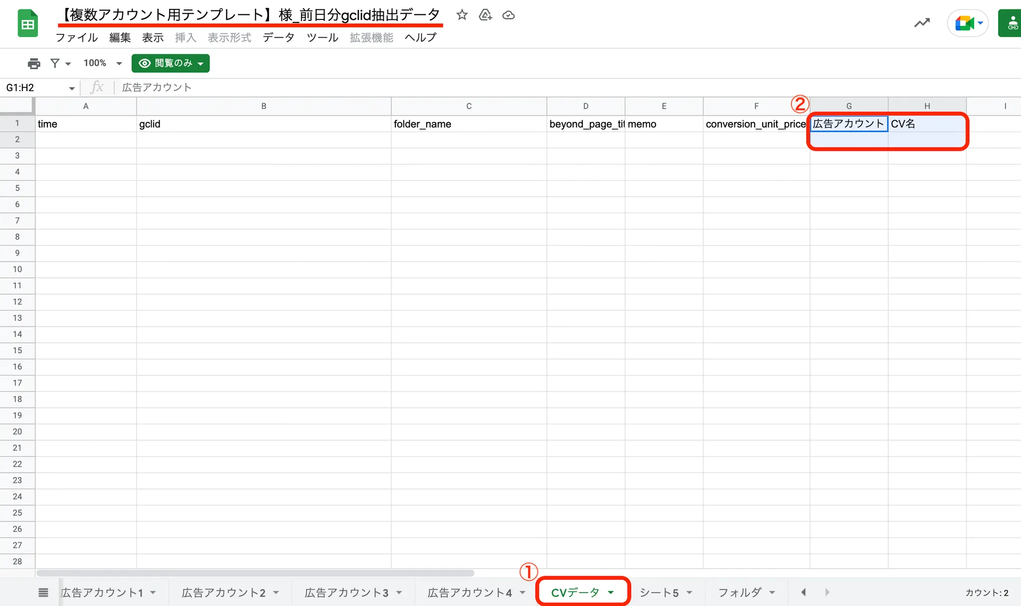 ※新規作成されたスプレッドシートを、それぞれの広告アカウントにインポートしていただくことで設定が完了します。