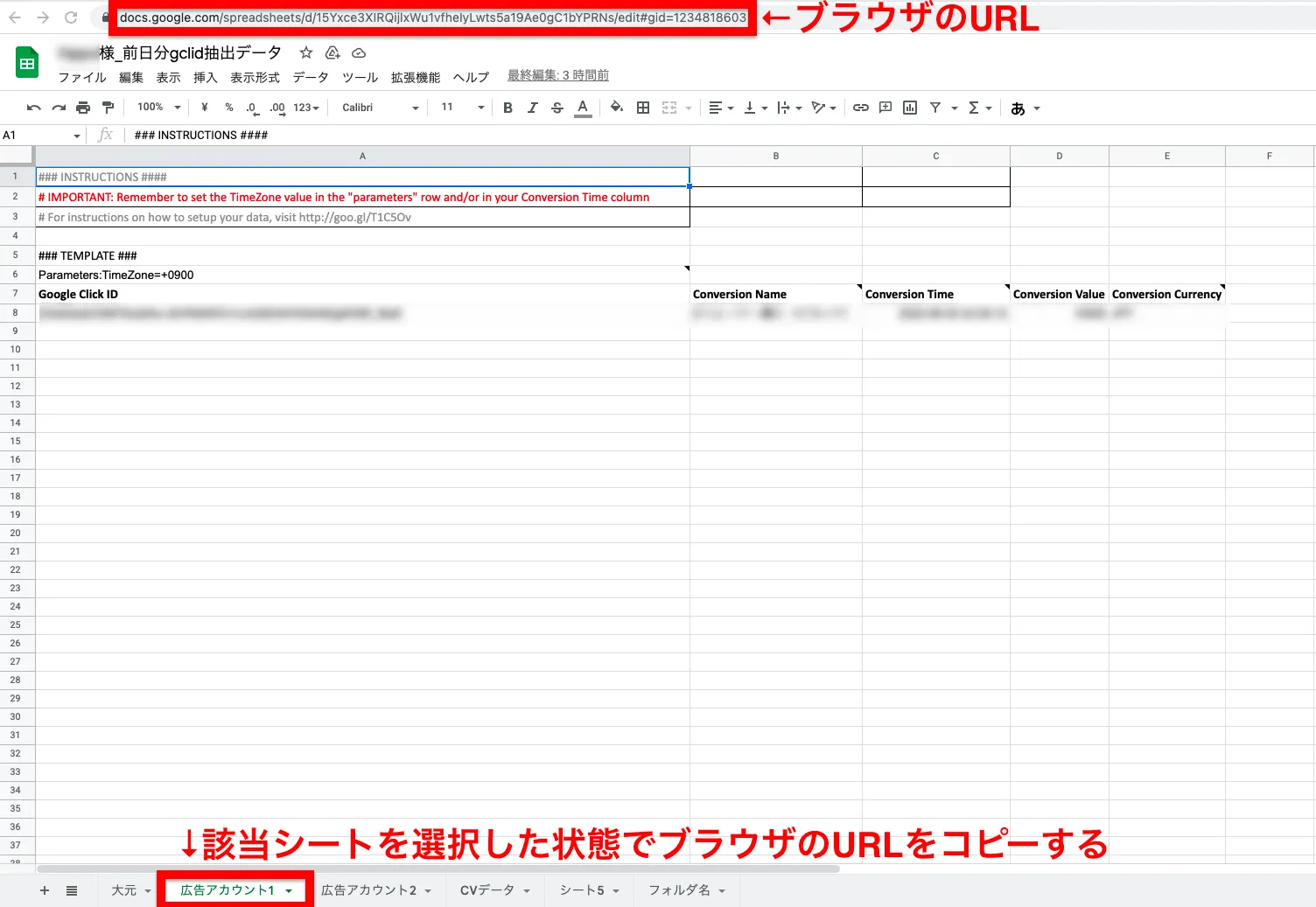 元シート:ご共有したシート(◯◯様_前日分gclid抽出データ)テンプレート:上記にある【複数アカウント用テンプレート】様_前日分gclid抽出データ