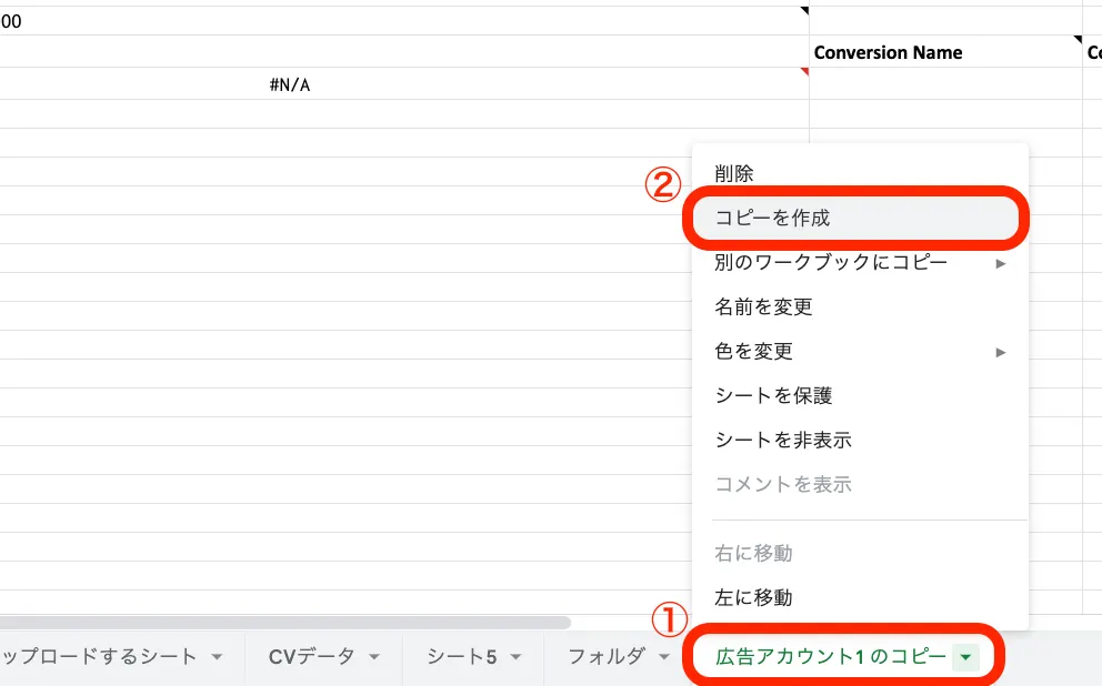 - 元のシートに追加された「広告アカウント1のコピー」を、必要な数(「フォルダ」シートのB列に追加した広告アカウントの数字分)だけさらにコピーする