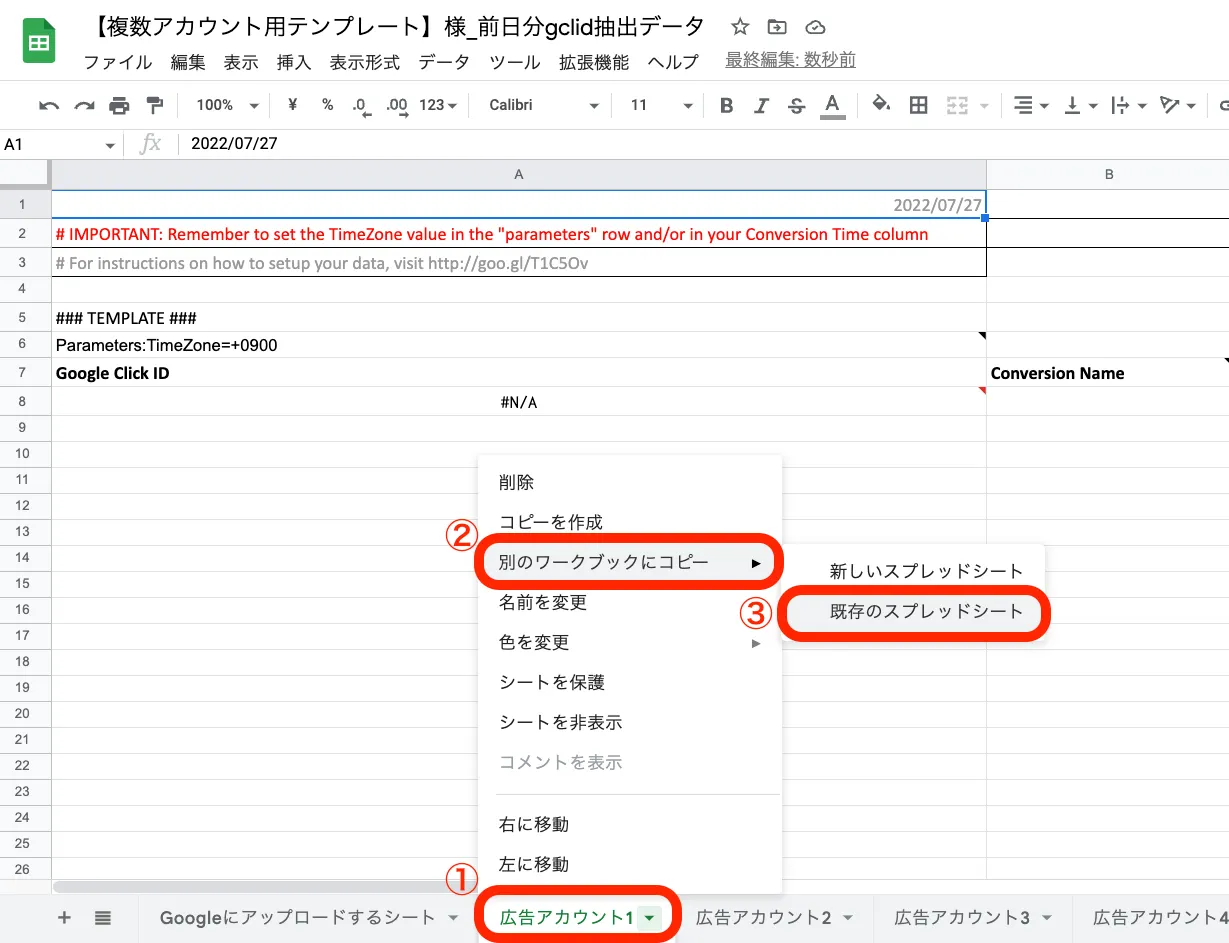 - シートの追加方法は、テンプレートの「広告アカウント1」を別のワークブックにコピー→既存のスプレッドシートで元のシートを選択してください