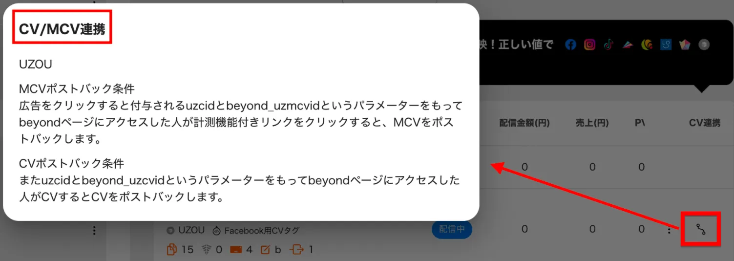 なお、beyondページ一覧の「CV連携」またはbeyondページ「基本情報」から、ポストバック条件が確認できます。