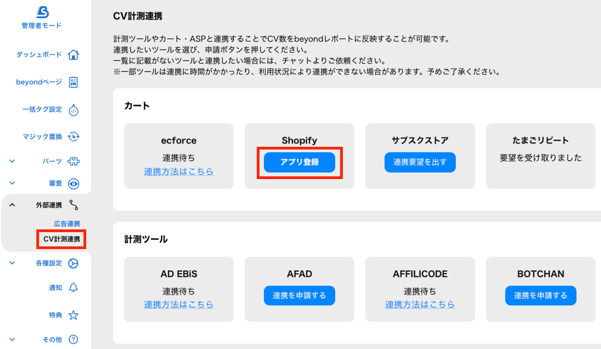 - 機能一覧>外部連携>CV計測連携>shopify「連携を申請する」