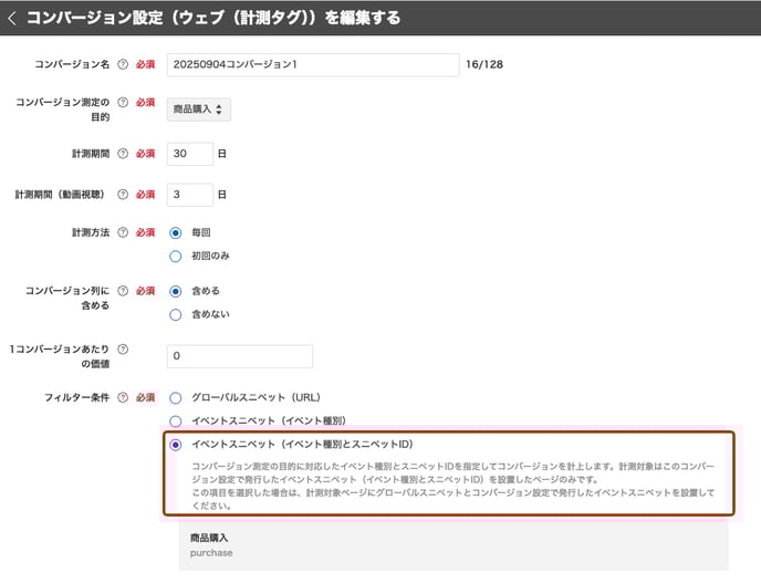 snippet_idはコンバージョン設定のフィルター条件で「イベントスニペット(イベント種別とスニペットID)」を選択している場合必須です。