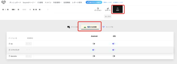 - スワイプLPエディタのバージョン編集画面 > 「運用」タブを選択 > モバイルOS別を選択