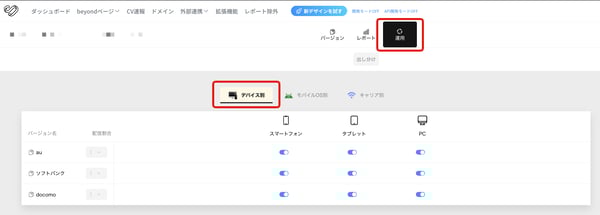 - スワイプLPエディタのバージョン編集画面 > 「運用」タブを選択 > デバイス別を選択