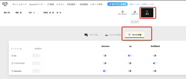 - スワイプLPエディタのバージョン編集画面 > 「運用」タブを選択 > キャリア別を選択